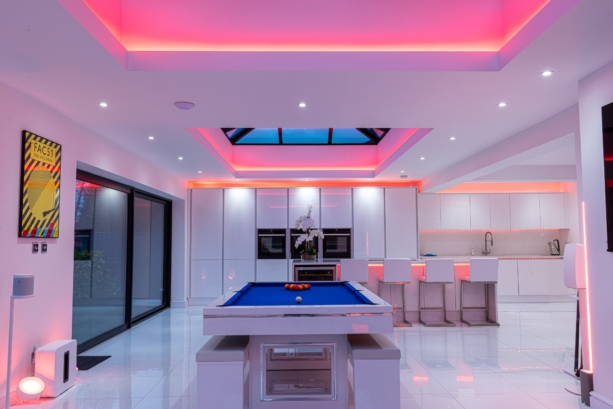 Such is the flexibility of smart lighting that, should you want to host a party, you can cater for the mood of every type of guest – programming colourful light changes for those who like to hit the dance floor, or creating a late-night bar vibe through toned down under-counter lighting for those who prefer to be ‘in the kitchen at parties’. Even within open plan spaces, individual corners can be turned into intimate spaces using dimmers and deeper lighting hues.