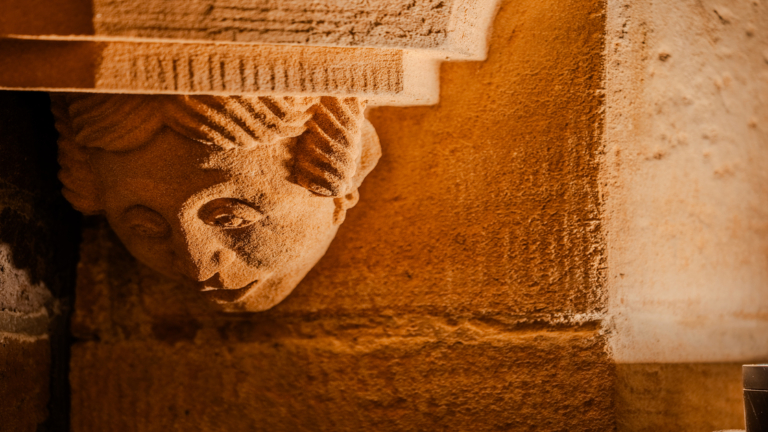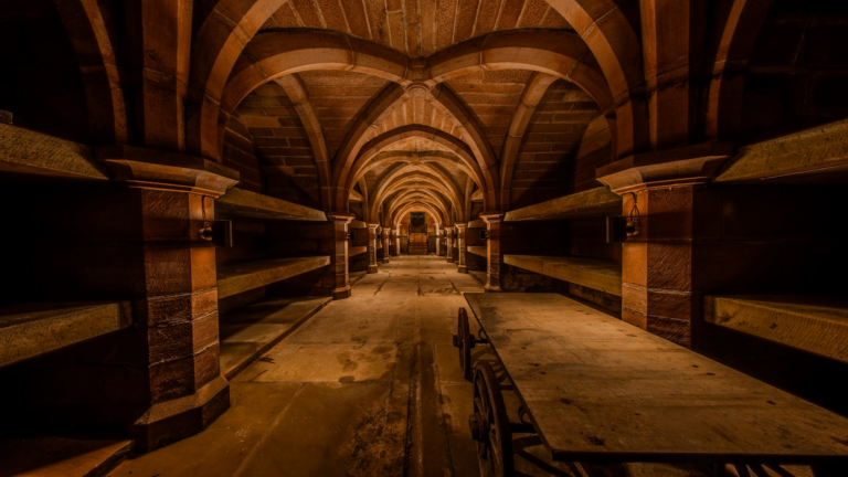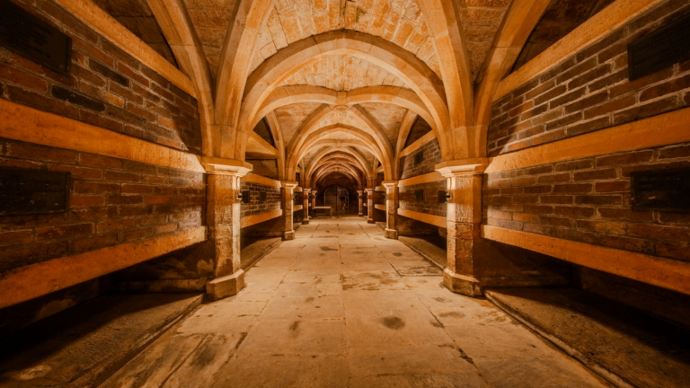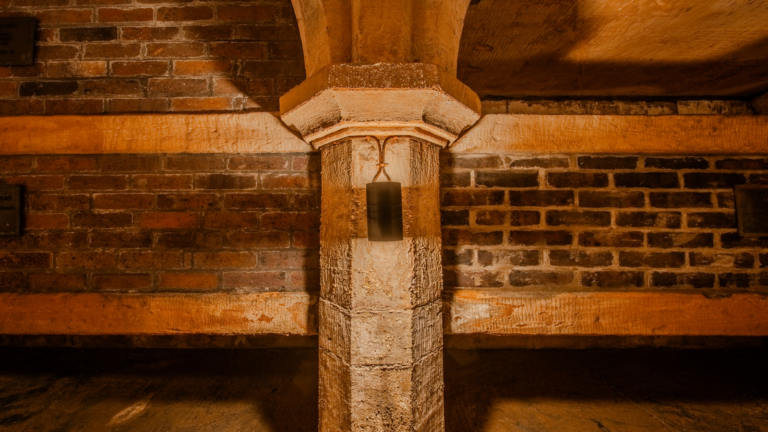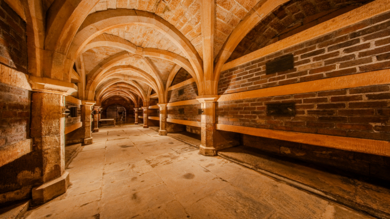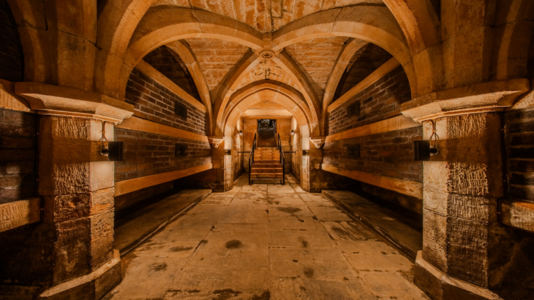 The upward light accentuates the crypt’s arched ceiling, washing the stonework in a soft, even glow that reveals the beauty of the vaulted structure.