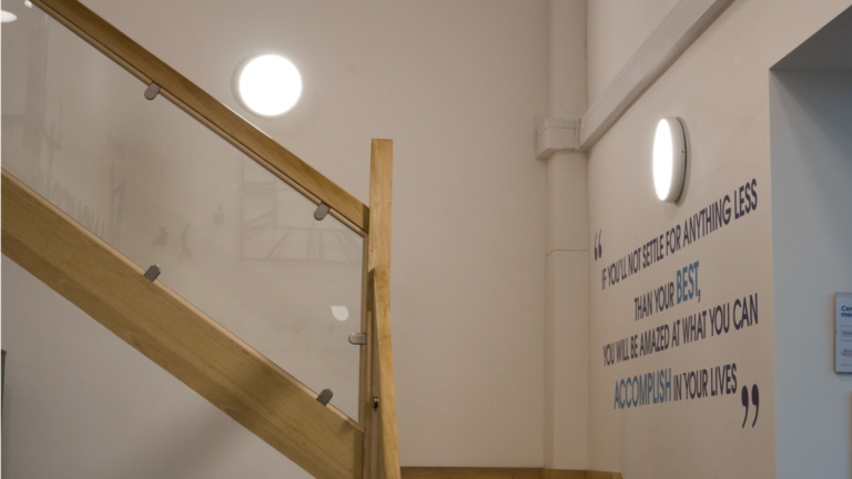 For the walls on the stairwell, the non-dimmable Gamma LED fitting was selected, with its ultra slim modern profile and matt white finish to the polycarbonate body and diffuser, with an optional chrome trim ring. Having rear fixing bracketry and terminal housing, this allows ease of installation. Maintained emergency versions are available. Option of integral microwave non-adjustable sensor option pre-set to 15 minutes at 3 metres, with integral photocell isolation switch, whilst including that the standard MWS and Emergency MWS/M3 versions offer capability in operating as “Masters”, which can be used in conjunction with standard “Slaves”, thereby offering optimum flexibility.