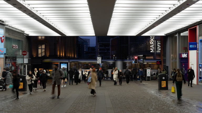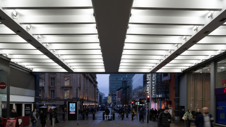 When it comes to shopping in and around the city of Manchester, it has to be the Manchester Arndale Centre, which offers a huge selection of retail outlets from leading high street names, through to a multitude of smaller, stylish specialist outlets, all located under one roof. With a central location, access is made easy with bus, train, and tram networks to the suburbs and beyond. When it came to providing a new lighting system to the covered walkway situated close to the main entrance, Ansell Lighting was the selected company to offer a lighting solution which produced a striking aesthetic appeal, whilst also providing adequate illumination for those walking through the covered walkway to enter the Arndale Centre or to continue up the pedestrian street towards Piccadilly.