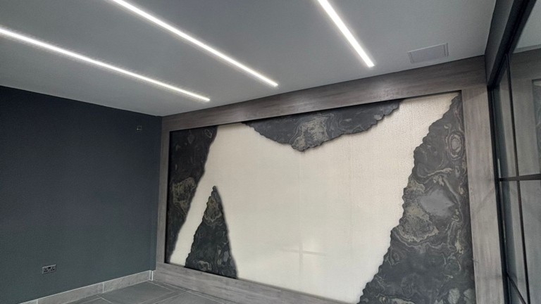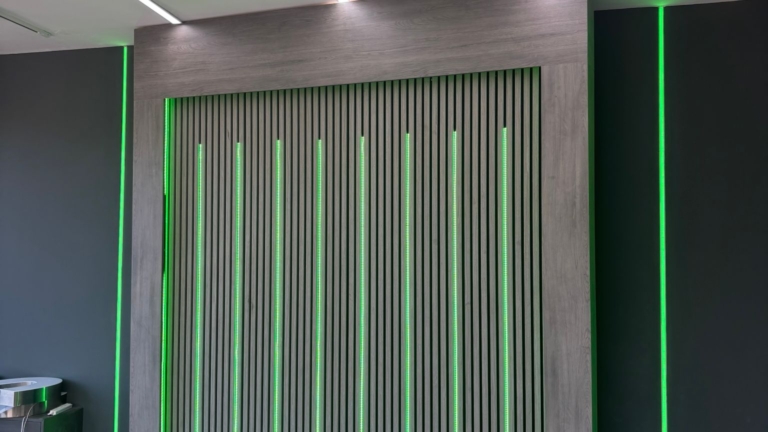 The client had a vision for what they wanted: a showroom that looked cutting-edge, with lighting that could adapt instantly to suit different displays. A tailored lighting scheme was developed to bring that vision to life, combining architectural linear lighting, adjustable track illumination, and smart controlled LED strip for feature areas and the media wall.