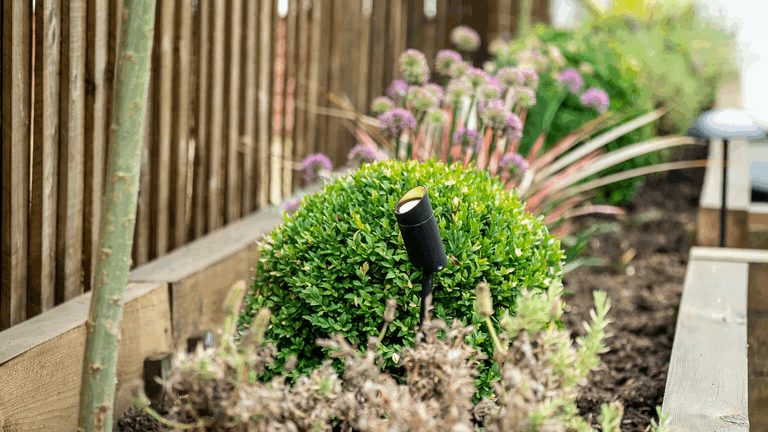 Once the hub was in place, the homeowner was able to complete the installation of the lighting elements themselves. The 24V plug-and-play design of the Foliar Connect range made this straightforward, with no need for specialist tools or wiring expertise. Black Spike Lights were positioned discreetly within planting areas to highlight shrubs and architectural features, while the black Planter Lights were installed along borders to provide a soft, ambient glow.